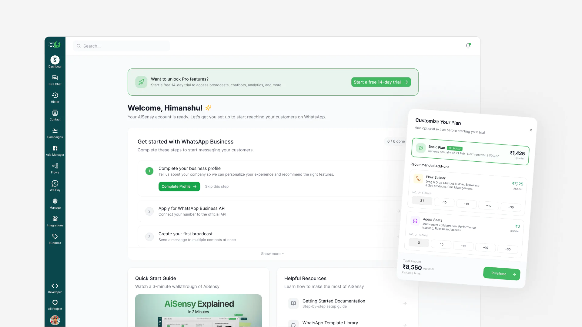 Led end-to-end UX redesign across onboarding, guided trials, pricing, and dashboard systems for a WhatsApp-focused SaaS platform.